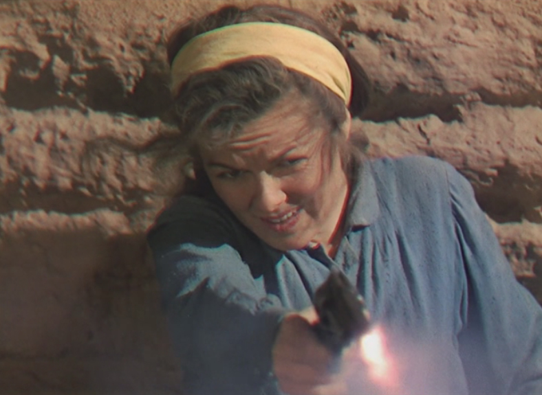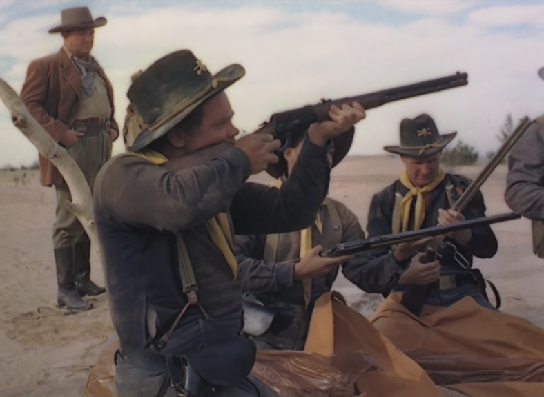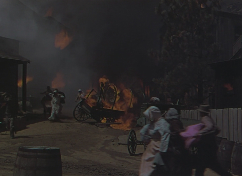 Sergeant Matt Trainor (Broderick Crawford) and five other cavalry troopers barely survive a massive Comanche attack led by the infamous Chief Black Cloud (John War Eagle) in which the isolated frontier town of Dry Buttes is totally destroyed. Driven into the Arizona desert and low on water, Sgt. Turner must rally his soldiers - among them are Lloyd Bridges and Martin Milner - by reminding them that they are still soldiers and the maintenance of military discipline is the only thing that will ensure their survival. They set out on a 100 mile journey to the closest settlement, Fort Macklin, through dangerous terrain that is crawling with redskins and no known sources of water. Along the way, they encounter a stagecoach with a motley crew consisting of Julie Lanning (Barbara Hale), whiskey drummer Henry Ruppert (Chubby Johnson), former cavalry scout Satterlee the Prophet (Milton Parsons) and stagecoach driver O'Rattigan (George Matthews) and the two parties join forces. Later, they also encounter a suspicious white man in the desert for apparently no reason, Denver Kinnaird (Hugh Sanders), who is keeping a very dangerous secret. The last passenger that our heroes come across is a young Kiowa Indian boy, Little Knife (Johnny Stewart), who only out of a nagging conscience do they let him join their ranks, but Little Knife saves the day when he takes them 30 miles off their course to an old abandoned mission that has a well! Just when things are looking up, Black Cloud attacks them - and his superior numbers are are extra-motivated by want of the precious water which our heroes now hold! Little Knife is sent off to deliver a message for help - but he's got to hurry as Black Cloud's swarm of Comanche warriors are ready to finish the survivors off! |