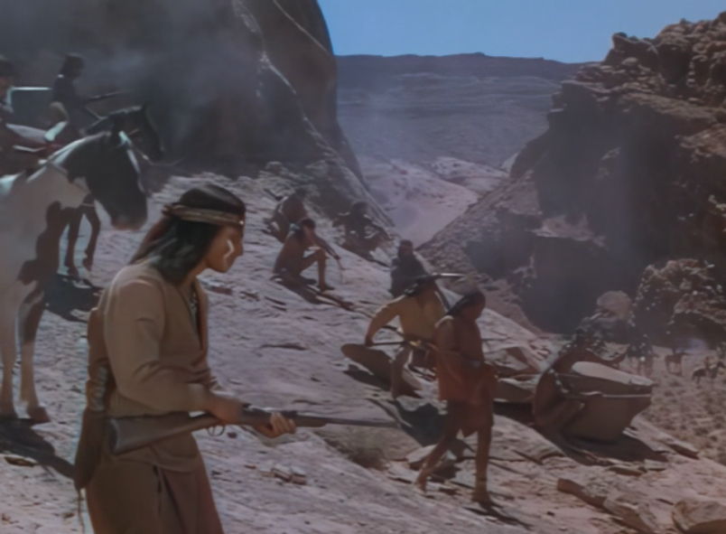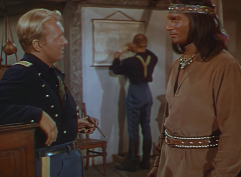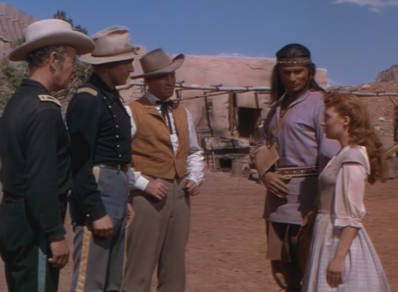 Major Jim Colton (John Lund) is the commanding officer of a fort in the western frontier, and has established a peaceful communal relationship with Cochise (Jeff Chandler) which is beneficial to both sides. But as the build up to the Civil War begins, hordes of US Soldiers are sent back east which emboldens some of the more rowdy Apaches including the formidable Geronimo (Jay Silverheels) who wishes to seize the opportunity to drive the white man out. Adding to this problem is the arrival of a crooked Indian-Affairs representative Mr. Baylor (Bruce Cowling) who is determined to break every treaty that has been made with the natives and forcibly resettle them to a designated reservation where there is nothing to hunt and the people would rely on government handouts. Despite the best efforts of Colton and Cochise, it isn't long before the whole Apache nation is on the warpath and the only hope for the Army is to retreat to Fort Sheridan. But to get there, they must travel through dangerous Apache Pass, where Geronimo and Cochise are waiting... |