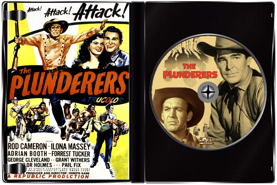 A gang of outlaws known as "The Plunderers" are terrorizing the west - headed up by Whit Lacey (Forrest Tucker). Apparently, the gang is receiving inside information from within the local town to help them set up their capers. Army Major John Drum (Rod Cameron)and Sheriff Sam Borden (George Cleveland) set up a plan where Drum will hopefully infiltrate the gang and thus lead to their eventual capture. Drum becomes friendly with Lacey to the point of "marrying" his girl friend Julie Ann (Adrian Booth) to aid in Lacey and Julie Ann's eventual escape. Drum while playing along with the masquerade, becomes smitten with saloon singer Lin Connor (Ilona Massey). All seems to go according to plan as Lacey is captured and taken to the army fort to be hanged... but just as justice is about to be served, an enormous horde of Indians attack the fort, and every able bodied person is needed to help in the defense! |