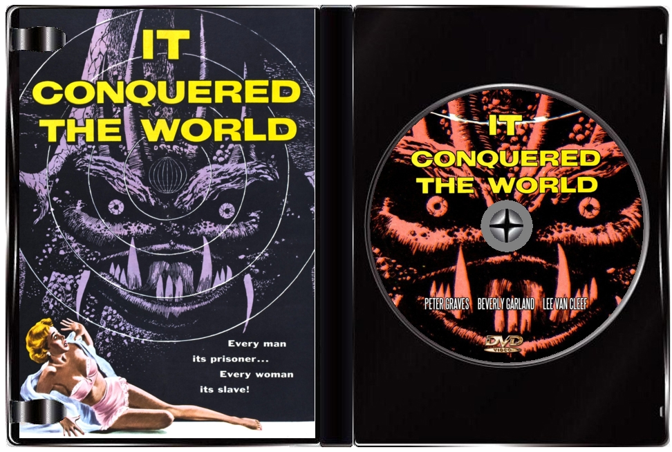 Here we have a hilariously horrendous schlock picture howler from the master of the genre, Roger Corman. Lee Van Cleef, looking very young and sporting a full head of hair, stolidly portrays a brilliant but disillusioned scientist who contacts a malevolent cucumber-shaped extraterrestrial from Venus over his private ham radio station. Van Cleef helps the creature come to Earth so it can take over the planet. Through the use of uproariously hokey mutant bat things which are propelled on obvious wires, it turns hapless humans into mindless slaves. Peter Graves, acting particularly starchy, plays Van Cleef's sole friend who decides to stop Van Cleef and the monster. Beverly Garland as Van Cleef's long-suffering wife spouts lots of hilarious lines ("So, that's what you look like; you're UGLY -- HORRIBLE!"). Dick Miller and Jonathan Haze, the latter affecting a ridiculous Mexican accent, supply gut-busting comic relief as a pair of eager soldiers. Corman's strangely inept yet brilliant direction, the silly, but sincere script by Lou Rusoff, Paul Blaisdell's wonderfully absurd vegetable monster design, the hilariously bad dialog ("The world is full of fatheads -- full to overflowing"), the spartan sets, a typically moody score by Ronald Stein, wooden acting, several heavy-handed stabs at philosophical introspection and general all-pervasive air of madly overreaching poverty-row desperation clinch this film's status as one of the all-time great ludicrously lousy 50's science fiction exploitation nuggets perfect for laughing yourself silly!. |